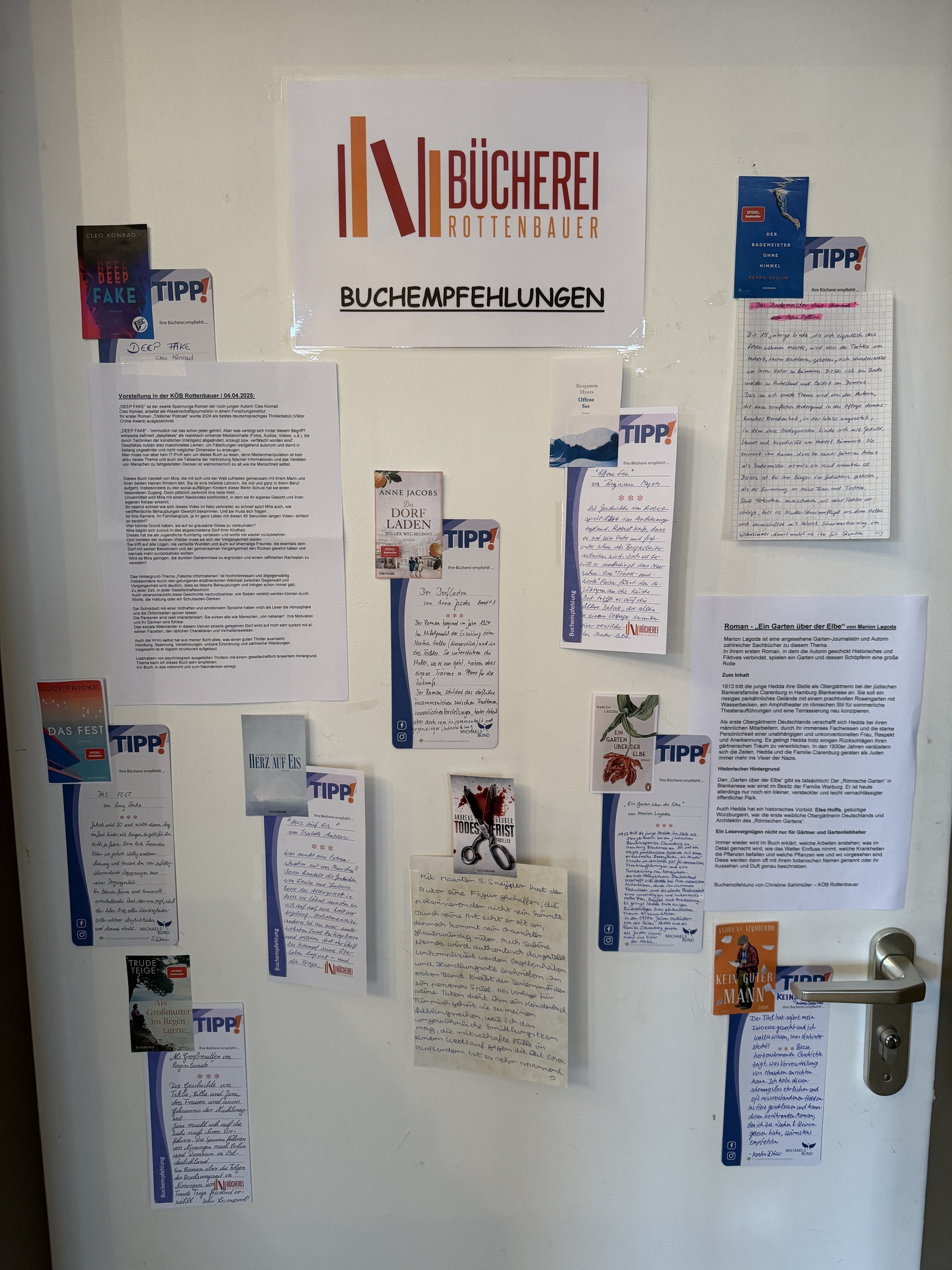 An der Eingangstüre der Bücherei finden Sie alle Empfehlungen des Büchereiteams zum "Nachlesen"