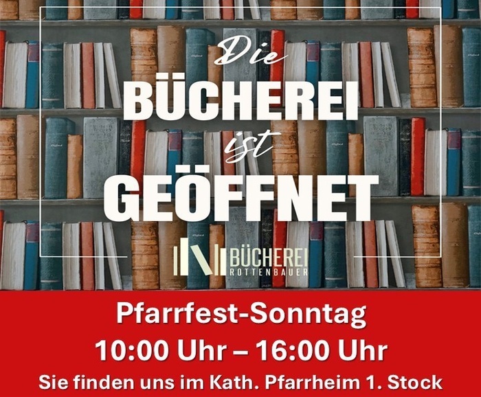 Zusätzlich hat die Bücherei am Pfarrfest-Sonntag durchgehend von 10:00 Uhr bis 16:00 Uhr für Sie geöffnet!